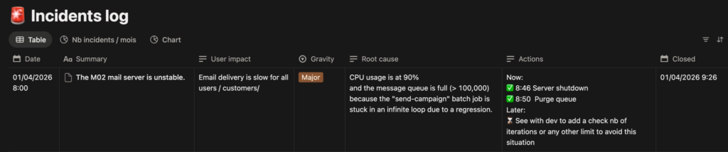 Avec l’équipe Ops, nous construisons donc notre Journal des incidents. L’objectif : mesurer et garder une trace de nos apprentissages.