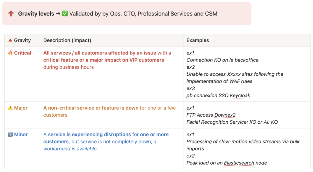 Initialement, entre nos SLA client, les niveaux de gravité dans nos tickets de support client (Zendesk chez nous), et les gravités dans les tickets Tech (Jira), il n’y a pas de cohérence. Chacun a son avis, son échelle de valeur.