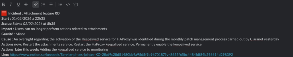 - communiquer dans le canal Slack #incident toutes les 20 à 30 min voire de proposer une communication en externe en fonction de la gravité.