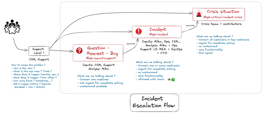 L’objectif de notre process : que chacun sache exactement quoi faire, apporter une forme de sérénité dans l’action afin que nos cerveaux restent concentrés sur la résolution. Et que les autres équipes — le CEO, le support, les CSM — soient rassurées sur la prise en charge.